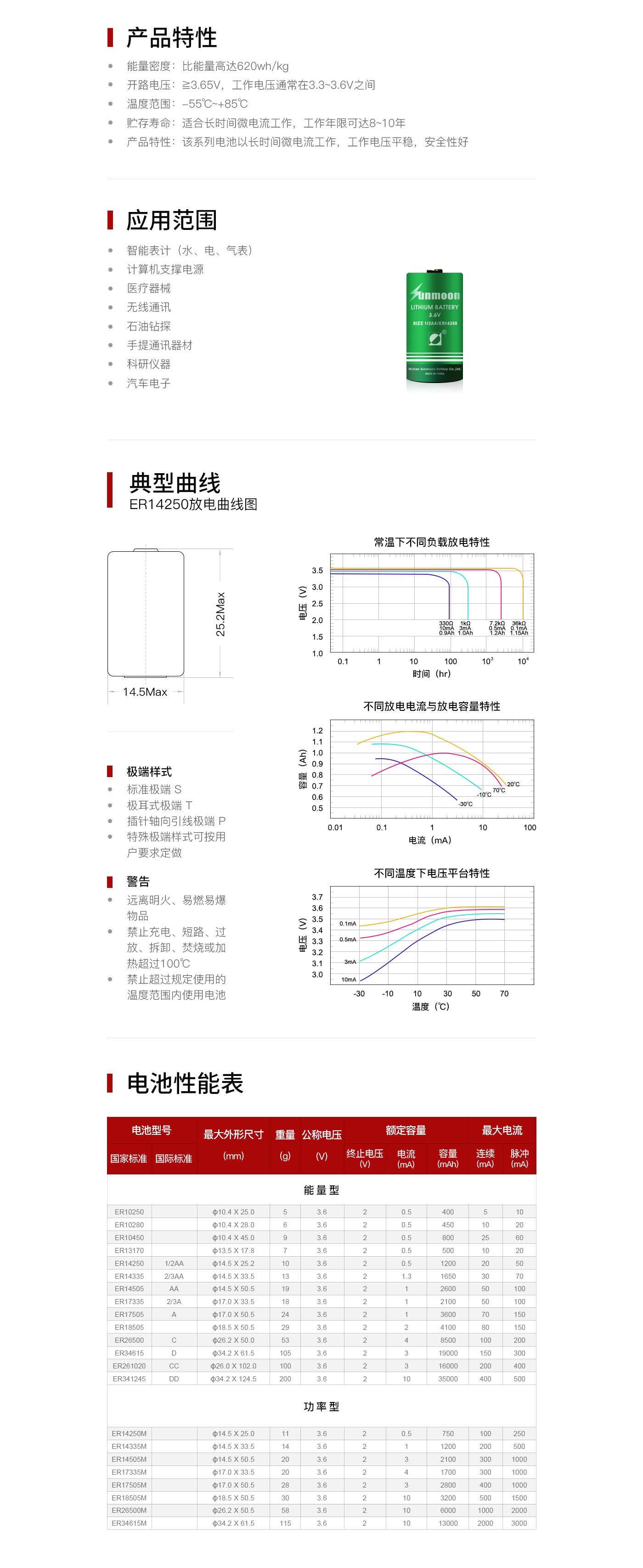 产品特性:该系列电池以长时间微电流工作,工作电压平稳,安全性好为主要特点。比能量高达620wh/kg。开路电压≧3.65V,工作电压通常在3.3~3.6V之间,90%以上的电池容量是在电压几乎不变的高电压平台输出的。温度范围:-55~+85℃。贮存寿命:适合长时间微电流工作,工作年限可达8~10年。应用范围:主要用于智能表计(水、电、气表)、计算机支撑电源、医疗器械、无线通讯、石油钻探、手提通讯器材、科研仪器、汽车电子等