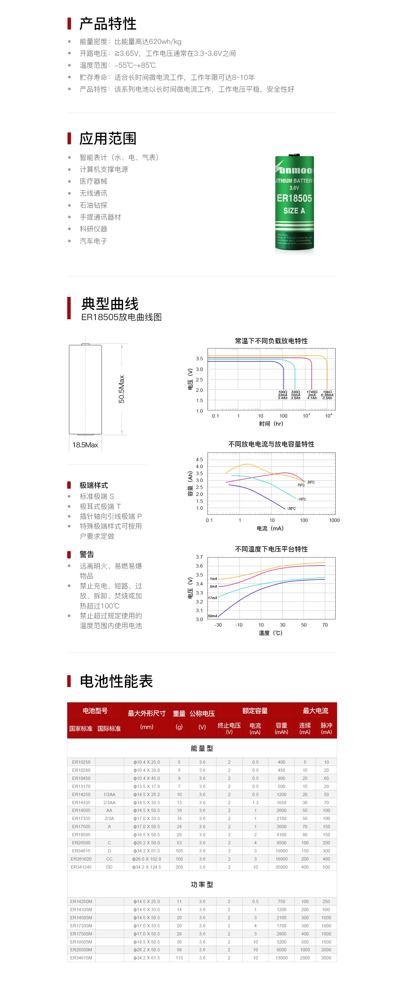 产品特性:该系列电池以长时间微电流工作,工作电压平稳,安全性好为主要特点。比能量高达620wh/kg。开路电压≧3.65V,工作电压通常在3.3~3.6V之间,90%以上的电池容量是在电压几乎不变的高电压平台输出的。温度范围:-55~+85℃。贮存寿命:适合长时间微电流工作,工作年限可达8~10年。应用范围:主要用于智能表计(水、电、气表)、计算机支撑电源、医疗器械、无线通讯、石油钻探、手提通讯器材、科研仪器、汽车电子等