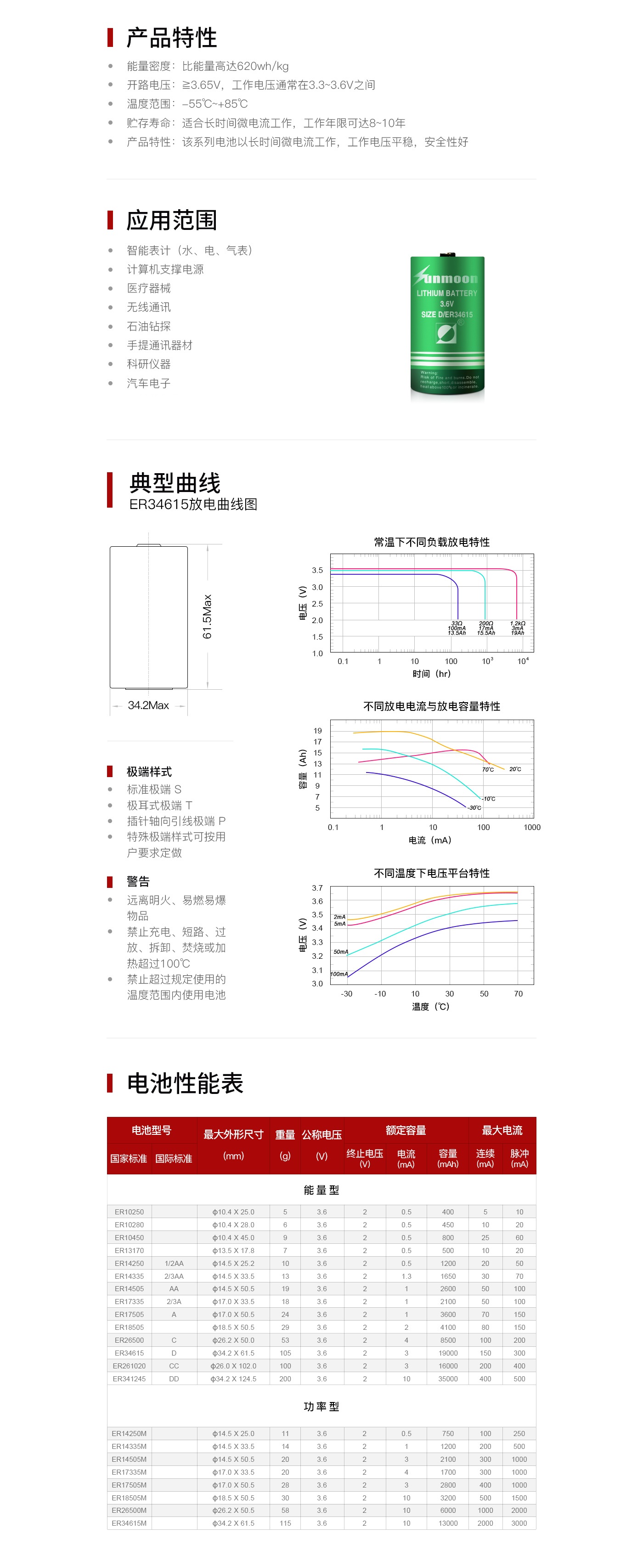 产品特性:该系列电池以长时间微电流工作,工作电压平稳,安全性好为主要特点。比能量高达620wh/kg。开路电压≧3.65V,工作电压通常在3.3~3.6V之间,90%以上的电池容量是在电压几乎不变的高电压平台输出的。温度范围:-55~+85℃。贮存寿命:适合长时间微电流工作,工作年限可达8~10年。应用范围:主要用于智能表计(水、电、气表)、计算机支撑电源、医疗器械、无线通讯、石油钻探、手提通讯器材、科研仪器、汽车电子等