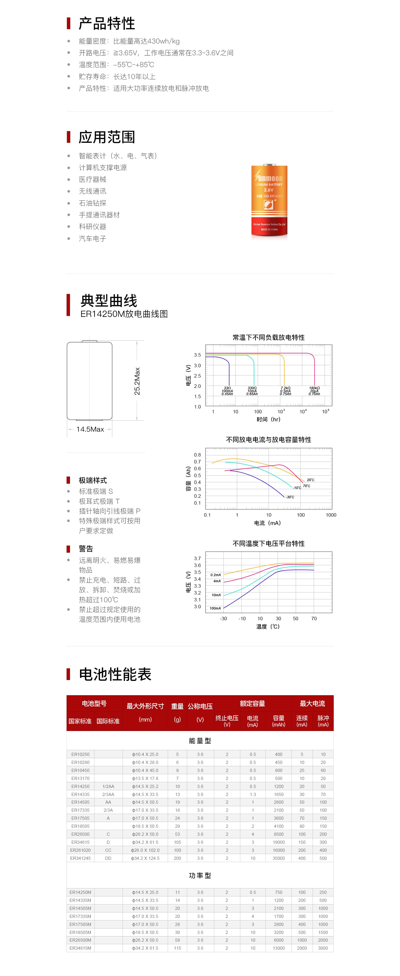 产品特性:该系列电池适合大功率连续放电和脉冲放电。比能量高达430wh/kg,开路电压≧3.65V,工作电压通常在3.3~3.6V之间,90%以上的电池容量是在电压几乎不变的高电压平台输出的。温度范围:-55~+85℃, 贮存寿命:长达10年以上, 应用范围:主要用于智能表计(水、电、气表)、计算机支撑电源、医疗器械、无线通讯、石油钻探、手提通讯器材、科研仪器、汽车电子等