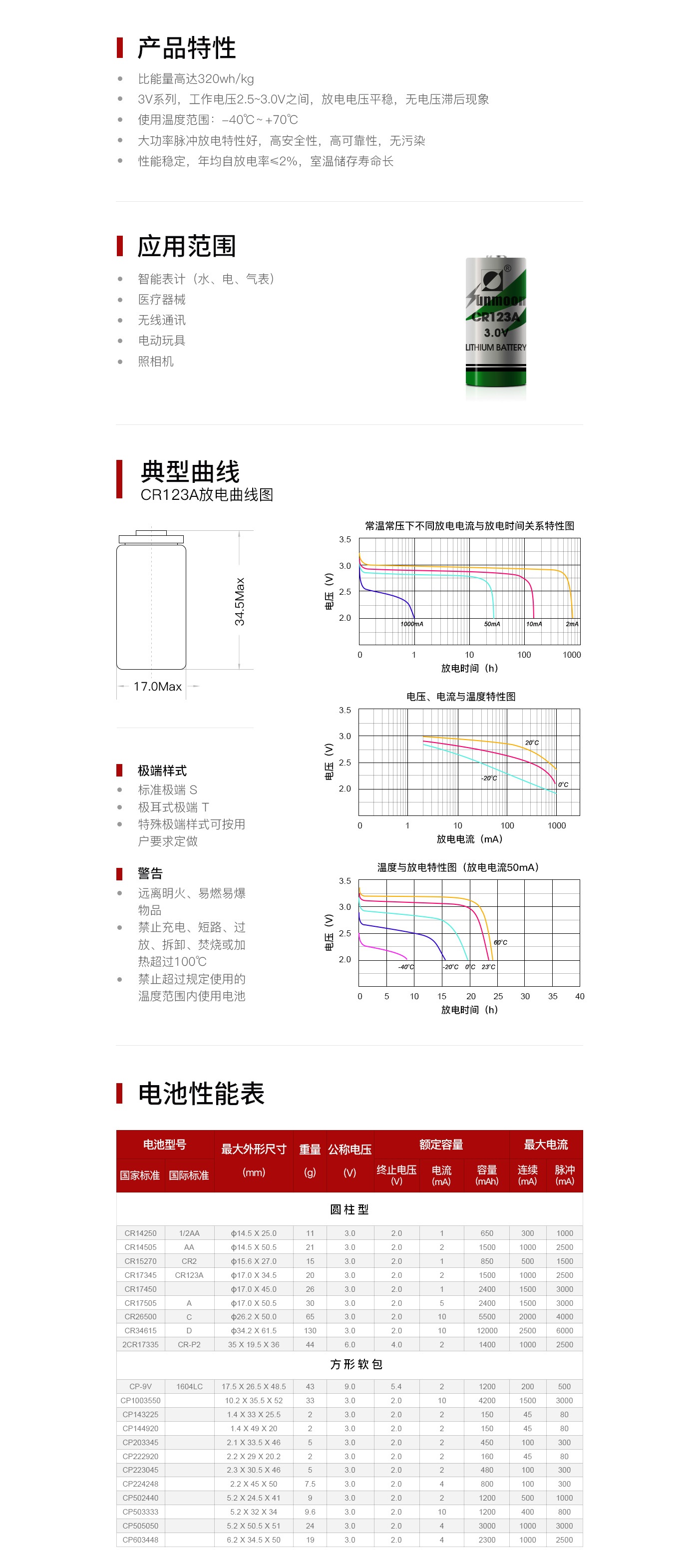 产品特性:比能量高达320wh/kg;3V系列,工作电压2.5~3.0V之间,放电电压平稳,无电压滞后现象;使用温度范围:-40℃ ~ +70℃;大功率脉冲放电特性好,高安全性,高可靠性,无污染;性能稳定,年均自放电率≤2%,室温储存寿命长;应用范围:主要用于智能表计(水、电、气表)、医疗器械、、无线通讯、电动玩具、照相机等领域