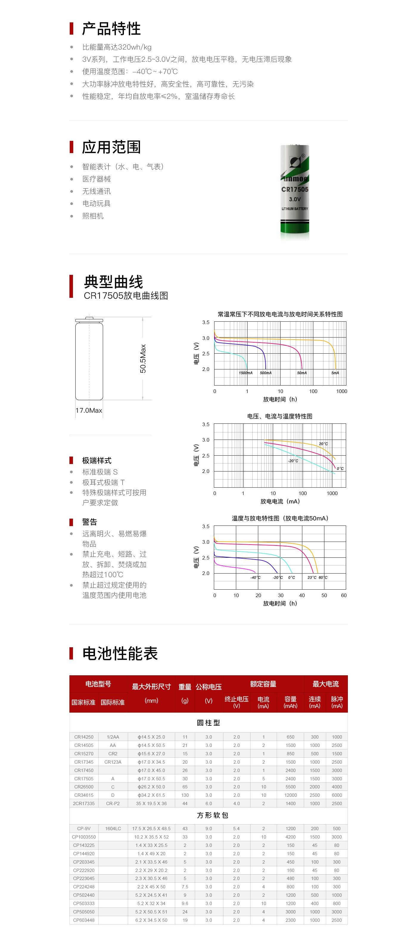 产品特性:比能量高达320wh/kg;3V系列,工作电压2.5~3.0V之间,放电电压平稳,无电压滞后现象;使用温度范围:-40℃ ~ +70℃; 大功率脉冲放电特性好,高安全性,高可靠性,无污染;性能稳定,年均自放电率≤2%,室温储存寿命长;应用范围:主要用于智能表计(水、电、气表)、医疗器械、、无线通讯、电动玩具、照相机等领域